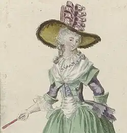 Während der Pelz in den Trachtenmützen und -hauben, auch der konservativen städtischen Trachten, blieb, ist er in den modischen Kopfbedeckungen des 18. Jahrhunderts kaum verwendet worden. Stattdessen thronten auf den hochgetürmten Frisuren Stoffhauben oder breitkrempige Hüte, üppig mit Feder- oder Blumenschmuck garniert. Nur gelegentlich wurde als Kopfputz etwas feiner Pelz verwendet, wie etwa Hermelin. Erst um die Wende zu 1900 wurde eine dem Mantel gleiche Verbrämung der Kopfbedeckungen häufiger.[11]
