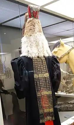 Zur Altenburger Tracht gehörte im 17. Jahrhundert eine auffällige, große, runde Mütze aus schwarzem oder braunem Bärenfell, die von einem die Stirn umspannenden Lederband gehalten wurde.[20] Im 18. Jahrhundert wurde sie bei den wohlhabenden Bauerstöchtern durch den sogenannten Saumagen ersetzt, einer annähernd zylindrischen, oben in der Mitte leicht vertieften und hier mit einem kleinen schwarzen Lederdeckelchen versehenen Zobelmütze, hinten hingen vom Deckel zwei Seidenbänder herab. Beim etwas kleineren Barthelchen hingen die Bänder seitlich und wurden unter dem Kinn gebunden.[21][22]