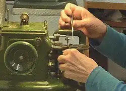 Ist eine Naht beendet, wird der Greifer durch das Drehen des Handrades bis kurz hinter das Nähteil bewegt, sofern die Maschine nicht einen Motor mit automatischer Nadelrückstellung hat, und etwas Faden von der Spannung abgezogen. Nachdem der vordere Teller durch das Fußpedal etwas gelüftet wurde, wird der Nähfaden durch einen scharfen Ruck des Felles nach unten rechts abgerissen.[10]
