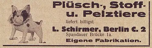 Verwendung finden in der Regel preiswerte Fellmaterialien. Bestimmte Fellarten eignen sich besonders zur Herstellung der Figuren. Allen voran steht das in großer Menge anfallende Fell des Kaninchens, im Handel als Kaninfell bezeichnet. Für Tiere mit flach anliegendem Haar ist es jedoch ungeeignet. Hier bieten sich stattdessen Kalbfelle und die im Leder zügigeren Zickelfelle an, die sich dadurch leichter an die Formen anpassen lassen. 1928 wurden die Abfälle bei der Verarbeitung von Antilopenfellen und Gazellenfellen als Material für die Spielwarenindustrie aufgeführt.[2] Die Firma Alfred Mayer & Co. aus Annaberg im Erzgebirge, ein Zentrum der Posamenten und Quastenherstellung, bot 1922 in ihrem Briefkopf unter anderem „Quasten für Fell-Tiere“ an.[3]