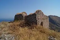 Die Burg liegt auf dem 476 m hohen Berg Kastraki 1,25 km südwestlich des Haupteingangs der Burg Akrokorinth. Die Burg maß in West-Ost-Richtung etwa 17 m und in Nord-Süd-Richtung etwa 35 m und hatte eine Größe von ungefähr 500 m². Die Außenmauer war etwa 2,50 bis 2,00 m dick und hatte sechs Schießscharten, die aus der zweiten Nutzungsphase stammten. Im Norden stand ein Turm mit einer Grundfläche von etwa 10,50 × 9,50 m. Das Erdgeschoss des Turmes bestand ursprünglich aus einem Raum, wurde jedoch später mit einer Mauer aus Porphyr in zwei etwa gleich große Räume geteilt. Der Zugang zum Turm erfolgte durch eine Tür im Süden. Der einzige Eingang zur Burg befand sich östlich des Turms.