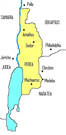 Nach dem Tode Herodes’ im Jahre 4 v. Chr. wurde Peräa bis 39 n. Chr. von Herodes Antipas regiert, der Johannes den Täufer in der Festung Machaerus enthaupten ließ.[7] Von 39–44 n. Chr. regierte Herodes Agrippa I. das Gebiet. Zu dieser Zeit wurde Peräa als Teil des jüdischen Landes betrachtet.[6] Da es zum Passahfest immer wieder zu Spannungen zwischen Juden und Samaritanern kam, zogen viele Juden aus Galiläa es vor, nicht durch Samarien, sondern durch Peräa nach Jerusalem zu reisen.