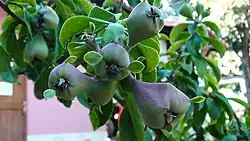 Die rosafarbenen, hellrosafarbenen oder mehr oder weniger purpurroten Blüten stehen in endständigen oder seitlichen Blütenständen aus 10 bis 15 (selten bis zu 30) Einzelblüten zusammen. Ihr Blütenstiel ist bis zu 3 Zentimeter lang. Sie erreichen Durchmesser von 3 bis 5 Zentimeter. Der Blütenboden ist kreiselförmig und weist Kanten oder Furchen und erhabene Höcker auf. Die birnen- bis kreiselförmigen Früchte stehen meist in Gruppen zusammen. Sie sind 5 bis 10 Zentimeter lang und weisen Durchmesser von 3 bis 7 Zentimeter auf. Bei Reife sind sie grün bis gelb.