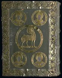 Im Rückdeckel ist zentral als einer von fünf Silberbeschlägen das Agnus Dei in einer kreisförmigen Rahmung umgeben von kleineren gleichartigen Tondi mit Personifikationen der Kardinaltugenden zu sehen.[10] Sie gehören zu einer größeren Gruppe vergleichbarer Gravierungen, deren hervorragendste Träger das in der Schatzkammer der Residenz aufbewahrte Kreuznagelreliquiar Heinrichs II. und das Reichskreuz repräsentieren.[10] Die vier bekrönten Frauenbüsten sind mit imperialen Gewändern bekleidet, die als vereinfachte Darstellungen byzantinischer Hofkleidung zu verstehen sind: Der breite Kragen entspricht dem Juwelenkragen der byzantinischen Kaiserin, dem Maniakon, der senkrechte Streifen dem Loros.[10]