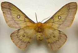 Die Falter erreichen eine Flügelspannweite von 62 bis 88 Millimetern, wobei die Männchen größer werden. Die Flügel sind dünn beschuppt.[1] Bei den Männchen sind die Fühler vierfach mit besonders langen, fächerförmig angeordneten, orangebraunen Kammzähnen gefiedert. Kopf und Halskragen sind rötlich gelb, der Thorax und der Hinterleib sind kräftig dottergelb. Die Grundfarbe der Tiere ist sonst hell ockergelb, am Vorderrand der Vorderflügel und im Submarginalbereich sind sie rosa. Die Vorderflügel tragen eine antemediane und eine postdiskale dunkelgraue bis schwarzbraune Querbinden, von denen die innere (antemediane) schwächer ausgebildet ist und die äußere (postdiskale), gezackte sehr kräftig gezeichnet ist. Die kleinen, rotbraunen Augenflecke sind schwarz umrandet. Die Hinterflügel sind wie die Vorderflügel gefärbt, ihnen fehlen jedoch die Augenflecke. Die Weibchen sehen den Männchen sehr ähnlich, haben jedoch eine großflächigere rosa bis blass-weinrote Flügelfärbung, die manchmal nahezu den gesamten Flügel umfasst. Die Grundfarbe an der Basis und am Innenrand der Vorderflügel ist mehr gelblich. Der plumpere Körper ist wie beim Männchen gefärbt, die Flügel sind langgestreckter und mehr abgerundet. Die Fühler der Weibchen sind mit kurzen Kammzähnen versehen.[2]