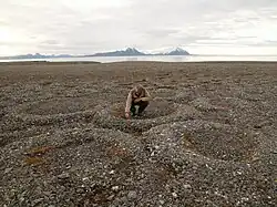 In der Arktis gibt es sogar submarinen Permafrost, also Permafrost am Meeresgrund.[28] Durch die eustatische Meeresspiegelabsenkung lagen während der letzten Eiszeit viele Kontinentalschelfflächen über dem Meeresspiegel, wodurch sich auf diesen Landflächen Permafrost bis in mehrere 100 Meter Tiefe bilden konnte.[29] Meerwasser, das den Schelf in der Nacheiszeit wieder überflutete, war zu kalt, um den nun submarinen Permafrost wieder auftauen zu können. Submariner Permafrost kann sich auch bilden, wenn in sehr flachen Gewässern Meereis auf dem Meeresboden aufliegt und die Sedimente darunter gefrieren.[26] Die bekanntesten submarinen Permafrostvorkommen liegen in der Laptewsee im Nordpolarmeer vor den Küsten Sibiriens.