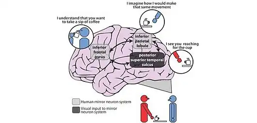 Neuronale Zentren der Perspektivenübernahme sind nach Singer (2006) der Polus temporalis (siehe zerebrale Pole), der posteriore Sulcus temporalis superior (STS) sowie der mediale präfrontale Cortex (mPFC).[5] Bei Prozessen der Perspektivenübernahme, von denen angenommen wird, dass sie auf sozialer Projektion beruhen wurde in der Forschung wiederholt das Default Mode Network (mPFC, Precuneus, Cortex cingularis posterior, Cortex parietalis lateralis) als relevante neuronale Grundlage identifiziert. Dieses Netzwerk ist sowohl beim Nachdenken über den mentalen Zustand anderer aktiviert (Perspektivenübernahme) als auch beim Nachdenken über die eigenen mentalen Zustände (z. B. sich das eigene Erleben in einer zukünftigen Situation vorstellen).[6] Das Netzwerk der Spiegelneurone stellt die neuronale Basis der Imitation dar. Entscheidend dabei ist, dass durch Spiegelneurone die Fähigkeiten, Ziele und Intentionen anderer Individuen verstanden werden können, obwohl diese nur beobachtet wurden.