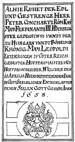 ALHIE RUHET DER EDL UND GESTRENGE HERR PETER CONCHARTZ RÖM. KAY. MAJ. FERDINAND III. HOCHSELIGSTER GEDECHTNUS UND DER ZU HUNGARN UND BÖHEIMB KHÖNIG. MAY. LEOPOLDI ERZHERZOGEN ZU ÖSTERREICH GEWESTER HOFBAUMEISTER UND HOFBAUSCHREIBER, WELCHER DEN 10. APRILIS IN GOTT SELIGLICHEN ENTSCHLAFEN. DESSEN SEELE GOTT GNADE. AMEN. 1658.