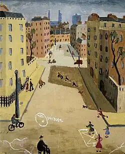 Straße in Pimlico, 1939, Aquarell und Gouache auf Papier. PrivatbesitzEinige Werke von Peter Purves Smith beziehen sich auf subtile Weise auf die politischen Unruhen seiner Zeit, insbesondere auf den Aufstieg des Faschismus und die Auswirkungen des Krieges. Dies zeigt sich in Gemälden, die Figuren wie Soldaten, militärisches Gerät und autoritäre Bilder enthalten, auch wenn diese oft durch seine surrealistische Linse gefiltert sind.
