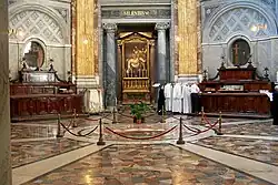 In den folgenden Jahrhunderten wurde der Bau durch die Wirren der Geschichte und durch zahlreiche kriegerische Ereignisse stark beschädigt. Besonders beim Angriff islamischer Invasoren (in der zeitgenössischen Literatur als Sarazenen und Mauren beschrieben[24]) auf Rom im Jahr 846 gingen viele Kunstschätze der damals noch vor den Mauern Roms befindlichen Basilika durch Plünderungen verloren. Die Kirche wurde aber immer wieder neu aufgebaut. Zeitzeugen des Mittelalters berichten von einer verwirrenden Vielzahl von Nebenaltären und Grabkapellen innerhalb des Kirchenbaus.[25]