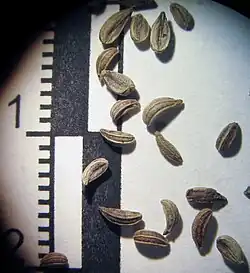 Die Doppelachänen sind bei einer Höhe von 2,5 bis 3 Millimetern sowie einer Breite von 1,5 bis 2 Millimetern breit-eiförmig und am Grund fast herzförmig.[7] Zwischen den Hauptrippen sind sie dunkelbraun, die Hauptrippen selbst sind hellgelb, sehr dünn und stehen deutlich vor.