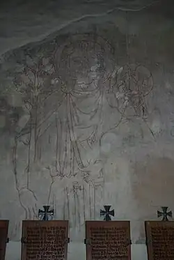 Die überlebensgroße Darstellung des heiligen Christophorus im westlichen Teil der nördlichen Langhauswand stammt vermutlich aus dem frühen 14. Jahrhundert. Sie liegt in Form einer Rötelzeichnung vor und ist nur bruchstückhaft erhalten; die ehemals farbige Ausmalung ist bis auf Reste im linken oberen Bildteil nicht mehr erkennbar.[12]