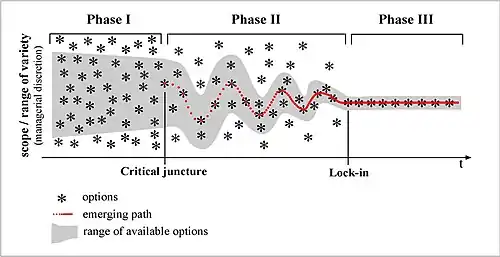 - Thomas S. Kuhn hat Pfadabhängigkeit in der Wissenschaft nachgewiesen und für die Phase III den Begriff des Paradigmas geprägt[17]. Hier sind es vor allem öffentliche Fördermittel, die in solchen Phasen auf das vorherrschende Forschungsfeld konzentriert werden. Fachtagungen richten ihre Leitthemen danach aus und Fachzeitschriften nehmen vorrangig entsprechende Beiträge an, denn angesichts einer immer größeren Zahl von Institutionen und Personen, die sich dem Paradigma zuwenden, lassen sich dadurch Teilnehmerzahlen und Auflagen steigern. Vor allem auch das Peer-Review, die gegenseitige Kontrolle unter Wissenschaftlern, trägt maßgeblich dazu bei, dass Arbeiten abseits des Paradigmas in Phase III kaum noch eine Chance erhalten. Ein daraus resultierender Vorteil besteht darin, dass dank der Bündelung von Kapazitäten im vorherrschenden Forschungsfeld relativ schnell große Fortschritte erzielt werden können. Nachteilig ist jedoch, dass alternative Lösungsmöglichkeiten und andere Fragestellungen unabhängig von ihrer Qualität und Dringlichkeit unerkannt bleiben.