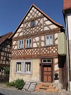 Das ehemalige Ackerbürgerhaus steht mit der Giebelseite zur Straße. Der zweigeschossige Bau mit massivem Erdgeschoss ist mit vielen Rauten geschmückt.