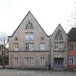 Im Gegensatz zu den anderen Häusern der Pfarrgasse besitzt das Gebäude zwei giebelständige Satteldächer. Die siebenachsige, traufständige Fassade des Hauptbaus entlang der Unteren Anlage gliedern drei einachsige Risalite, dazwischen jeweils zwei Fensterachsen. Die Risalite haben einen Spitzgiebel, darunter ein zweibahniges Maßwerkfenster mit profilierten, spitzbogigen Rahmen gefolgt von Doppelfenstern mit Mittelpfosten im Ober- und Erdgeschoss. Die zugehörige Giebelfront prägt ein dreiachsiger Schaugiebel, der höher als der Dachfirst ist, wobei der Dachfirst zur Giebelspitze ansteigt. Ein Gesimsband in Höhe der Fensterbrüstung trennt Erd- und Obergeschoss. Die mittlere Achse ist wie die Risalite der Längsseite aufgebaut, die beiden äußeren Fensterachsen schließen oben Bogendreiecke ab.[1]