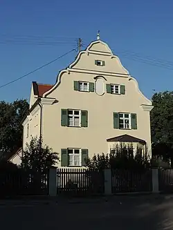 Der Neubau, ein barockisierender zweigeschossiger Satteldachbau mit Schweifgiebel, besitzt zwei zu drei Fensterachsen.