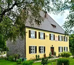 Das ehemalige Schlösschen wurde als Sitz des Propstes des Klosters Sankt Mang von Johann Georg Fischer erbaut. Der zweigeschossige Walmdachbau mit Schleppgauben besitzt fünf zu fünf Fensterachsen. Die sechs- bzw. achtteiligen Fenster haben Holzläden.
