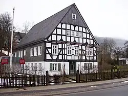 Im Jahr 1682 wurde das Haus beschädigt und 1711 wieder aufgebaut. Das untere Geschoss des zweigeschossigen Fachwerkbaus besteht aus massiven weißen Wänden. Das Dach und die linke Hausseite des Obergeschosses sind mit Naturschiefer verkleidet. Die anderen Seiten des Hauses bestehen aus typischem Fachwerk.