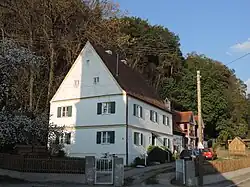 Der zweigeschossige durch Gesimsbänder gegliederte Satteldachbau besitzt drei zu zwei Fensterachsen, die beim Umbau in den 1950er Jahren auf die heutige Anzahl reduziert wurden.
