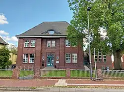 Das zweigeschossige traufständige verklinkerte Gebäude mit ziegelgedecktem Walmdach mit mittiger Fledermausgaube wurde 1929 nach Plänen von Regierungsbaumeister Friedrich August Wilhelm Schuckmann (Bremen) gebaut, aus Mitteln der Geschwister Ries. Die symmetrischen Fassaden wurden gestaltet durch einen mittigen Eingang, lisenenartige Vorsprünge und Backsteinverzierungen. Im Westen steht ein zugehöriger eingeschossiger Konfirmandensaal von um 1936 mit gestaffeltem Volutengiebel.[1]