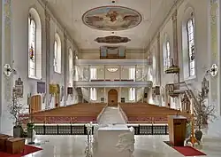 Innen die Kirche ein Saalraum mit einer Flachdecke über einem umlaufenden Gesims. Die Langhauswände sind mit gekoppelten Rundbogenfenstern und breiten Wandpilastern gegliedert. Die Stuckkartuschen sind gemalt, ebenso wie die Kapitelle und die Fensterbekrönung. Ein eingezogener und runder Chorbogen trennt das Langhaus vom eingezogenen 5/8-Chor mit Flachdecke über einem umlaufenden Gesims. In der Stirnwand befinden sich gekoppelte Rundbogenfenster und ein Kreisfenster.