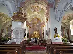 Der barocke Chor hat nach einem schmäleren platzlgewölbten Vorjoch ein zentrales durch eine Hängelkuppel betontes Chorjoch mit einem Segmentbogenschluss mit Pilastergliederung mit vergoldeten ionischen Kapitellen. Der Chor zeigt eine reiche scheinarchitektonische Wand- und Deckenmalerei der Werkstatt Joseph Adam von Mölk mit Chronogramm 1772 am Triumphbogen.
