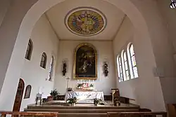 Der Hochaltar zeigt das bemerkenswerte Altarblatt des Stifters mit seiner Familie in Anbetung der Gottesmutter und der Namenspatrone Matthias, Emmerenzia und Johannes der Täufer, gemalt von Joseph Tunner (1844). Er trägt die gotischen Seitenfiguren Katharina und Barbara (um 1420). Auf dem rechten Seitenaltar steht eine gotische Figur Johannes aus dem 2. Viertel des 15. Jahrhunderts. In Wandnischen befinden sich die Figuren von Heinrich und Elisabeth aus der 2. Hälfte des 19. Jahrhunderts. Die Kreuzwegbilder nach Führich sind aus der 2. Hälfte des 19. Jahrhunderts.[2] Die Orgel aus 2005 mit 16 Registern stammt von Martin Pflüger.[3]
