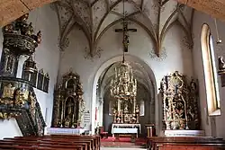 Über dem dreijochigen Langhaus erhebt sich ein spätgotisches Sternrippengewölbe. Das Langhaus wird durch zwei achteckige Pfeiler in drei Schiffe unterteilt. Die beiden östlichen Joche sind mit einem einzigen Stern überwölbt, der früher aus einer Mittelstütze ruhte, die 1851 entfernt wurde. Das Gewölbe ist in den Zwickeln mit Blatt- und Blütenwerk vom Ende des 15. Jahrhunderts bemalt. Auf den unteren Schlusssteinen sind die Halbfiguren der zwölf Apostel, auf den kleineren quadratischen Schlusssteinen Wappen dargestellt. Die Rippen des Gewölbes enden in Konsolen bzw. in einem profilierten Wandpfeiler an der Südwand. Die dreiachsige spätgotische Orgelempore mit einer Rundbogenarkade im Mittelteil ist sternrippenunterwölbt. Die mechanische Schleiforgel wurde 1842 von Barthelmä Herbiger gefertigt.