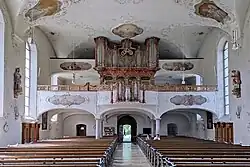 - Die Orgel war eine Arbeit von Josef Gabler aus Ochsenhausen; sie entstand 1768 bis 1771 und war sein letztes Werk. Das Orgelgehäuse fertigte 1772 der Bildhauer Johann Heinrich Reichart aus Bregenz an. 1974 baute man in das Gehäuse eine neue mechanische Orgel der Kremser Firma Gregor Hradetzky mit 34 Registern ein. In der Mitte befinden sich oben zwei einander zugeneigte Wappenschilde, der heraldisch rechte zeigt das Wappen des Erzherzogtums Österreich. Das linke Wappen stellt dasjenige der Grafen von Bregenz dar.