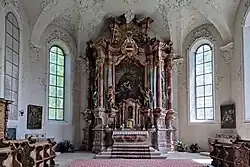 - Abraham Bader aus Wessobrunn gestaltete den Hochaltar im Jahre 1746. Im Auszug ist die geschnitzte heilige Dreifaltigkeit dargestellt, Christus links, Gottvater mit der Weltkugel rechts, die Taube des Heiligen Geistes in der Mitte innerhalb eines Wolkenkranzes. Die Altarfiguren stellen außen Papst Gregor links und den namengebenden Kirchenpatron Gallus rechts dar, jeweils zwischen den äußeren Säulenpaaren aufgestellt, innen die Apostel Petrus links und Paulus rechts, das Altargemälde flankierend. Alle genannten Schnitzarbeiten stammen von Johann Georg Brem aus Kempten. Das Altarbild zeigt die Anbetung durch die Hirten, ein Werk von Franz Georg Herrmann aus Kempten. Am Gemäldescheitel unterhalb des Strahlenkranzes rings um die Taube des Heiligen Geistes ist das Wappen Österreichs angebracht, in Rot ein silberner Balken, bekrönt vom erzherzoglichen Ranghut. Die Ausstattung der Kirche fällt in die Regierungszeit von Maria Theresia, Erzherzogin von Österreich und Römisch-deutsche Kaiserin. Sie hat selbst 1500 fl. für diesen Altar gestiftet. Das wurde vom Künstler honoriert, indem er der Hirtin hinten rechts in der Anbetungsszene, die durch ihr helles Gesicht die Aufmerksamkeit mit den Hauptfiguren teilt, die Züge von Maria Theresia verlieh.