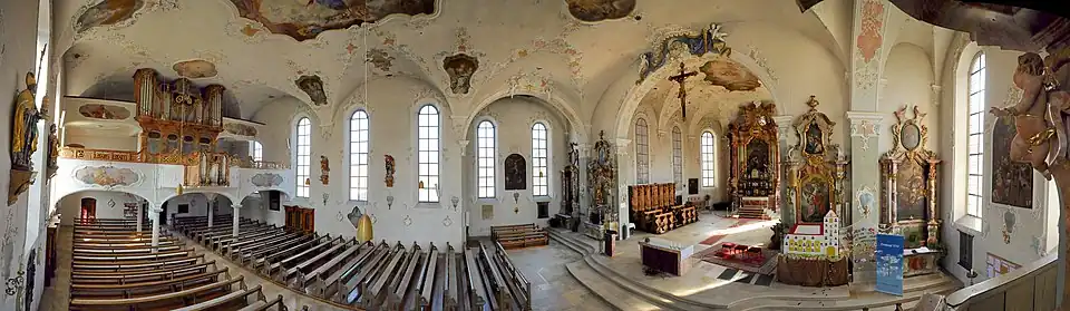 Das flachgedrückte Stichkappengewölbe des dreijochigen Langhauses ruht auf Wänden mit Stuckkapitellen ohne Pilasterauflage. Die niedrigen, querschiffartigen Seitenkapellen sind mit Gurtbögen auf Wandpfeilern zum Langhaus geöffnet. Ein eingezogener, rundbogiger Triumphbogen verbindet Langhaus und Chor. Der zweijochige Chor mit 3/8-Schluss hat Rundbogenfenster. Die Doppelempore im Langhaus ruht auf vier Steinsäulen über dreiachsigen Bogenstellungen.