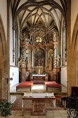 Die Einrichtung ist barock (Hochaltar 1722, Hängekanzel 1721/35), die Glasfenster sind neugotisch (Hanns Schock, 1897) und ‚modern' (Theo Braun, 1977, 1990/91).