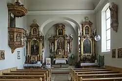 Das Deckengemälde Mariä Himmelfahrt und Eckmedaillons Salome mit dem Haupt Johannes des Täufers und Sündenfall, Esther vor Ahasver sind vom Maler Georg Troxler aus Luzern aus 1906. Der Hochaltar aus 1682 zeigt das Altargemälde Hl. Achatius vom Maler Pater Rudolf Blätter OSB aus 1907. Das Oberbild Mariä Verkündigung, wie auch die Altarbilder des linken und rechten Seitenaltares sind von Melchior Paul von Deschwanden aus 1854. Die Kanzel mit Schalldeckel aus 1800 zeigt am Korb die vier Kirchenväter. Die Kreuzigungsgruppe an der linken Langhauswand ist vom Bildhauer Ferdinand Stuflesser um 1900. Das Weihwasserbecken an der südlichen Außenwand wurde 1828 errichtet.