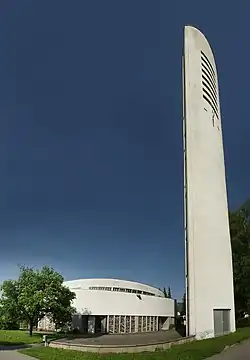 Die Kirche ist ein Zentralbau über einem elliptischen Grundriss mit hohen Fensterwänden. An den Zentralbau ist die Taufkapelle angebaut. Der Kirchturm ist freistehend.