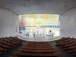 Das Kircheninnere ist ein Einheitsraum auf dem Grundriss einer Ellipse. Der Raum wird von einer weiten Decke mit zahlreichen Beleuchtungskörpern überspannt. Das Altarbild wurde 1987 von Hubert Schmalix gemalt und verbindet Schöpfung und Vollendung in einem Bild. Auf der linken Seite sind Adam und Eva sowie die getötete Schlange dargestellt. Auf der rechten Seite ist die blaue Paradiessäule mit dem „Reigen der Erlösten“ zu sehen. Mittig wurde der auferstandene Jesus im Strahlenkranz mit Wundmalen und übergroßen Händen gemalt.