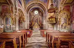 Das dreieinhalbjochige Langhaus wird von einem Platzlgewölbe überspannt. Es hat zwei Seitenkapellen sowie mehrere Emporen. Die Fenster stammen genauso wie die Orgel aus dem Jahr 1910.[1][3]
