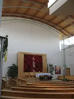 Das schlichte Kirchengebäude ist ein freistehender Rechteckbau, dessen gewölbtes Dach auf Stahlstützen ruht. Der niedrige Glockenturm ragt kaum aus der Umgebung hervor. Unter dem Dach befindet sich ringsum eine Reihe mit Fenstern, die den Innenraum erhellen. Die Orgelempore über dem Eingang ist eine Holzkonstruktion. Die Kirchenbänke reihen sich halbkreisförmig um den zentralen Altarbereich an der Westseite. Einziger Schmuck des Innenraums sind großformatige Kreuzwegbilder von Veronica Schaller aus dem Jahr 2006.