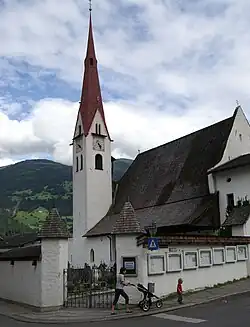 Urkundlich wurde 1183 eine Kirche und 1212 eine Pfarrkirche genannt. Die Kirche war zumeist von Domherren aus Brixen besetzt. Die Chor- und Langhausmauern wurden 1330 genannt. Das Langhaus wurde 1494/1497 verändert, mit Lisenen an der Südwand und zwei gekehlten Portalen. Nördlich am Langhaus ist eine hölzerne Vorhalle angebaut. Der Nordturm mit einem Spitzhelm entstand 1495.