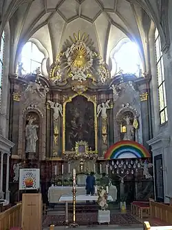 Der Hochaltar mit einem dreiteiligen wandartigen Aufbau mit Hermen-Engel und Polierweiß-Statuen von 1757 bis 1770 von Kaspar Timpf und den Statuen Josef und Leopold von Franz Wittmann zeigt das Altarblatt Enthauptung des heiligen Sixtus von Martin Johann Schmidt 1770.