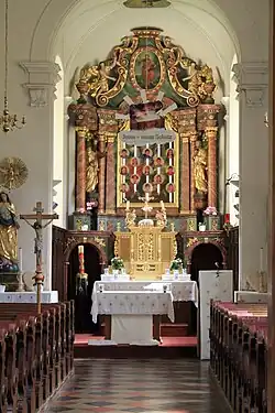 Der Hochaltar mit Opfergangsportalen und vorschwingenden Seitenteilen entstand um 1840, er trägt mit das Altarbild Christus und Maria Magdalena in romantischer Landschaft mit einer Säulenruine des Malers Brandstätter.