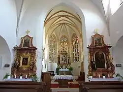 Der dreijochige Hauptchor mit Fünfachtelschluss und Kreuzrippengewölben auf halbrunden Diensten ist leicht erhöht und etwas höher als das Mittelschiff, mit dem er durch einen spitzbogigen Triumphbogen verbunden ist. Er hat an der Südseite eine Sessionsnische mit Kleeblattmaßwerk und gegenüber davon eine Sakramentsnische mit profilierter Stabrahmung und Spitzgiebel. Die Tür zur annähernd quadratischen, kreuzrippengewölbten Sakristei hat ein Schulterbogenportal.