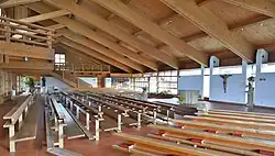 Das Langhaus ist ein polygonaler Raum mit zeltdachförmiger Holzdecke. Auf der Empore steht die Orgel.