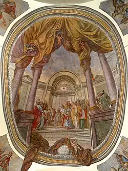 Die Deckengemälde malte Franz Xaver Dobler 1795, sie zeigen an den Pendentifs die vier römischen Kirchenlehrer, in der Kuppel Christus und die Ehebrecherin in einer großen frühklassizistisch inspirierten Scheinarchitektur mit reich trapierten Säulen, im Chor Auge Gottes in einer Engelsglorie.