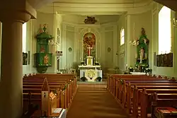 Das Kircheninnere zeigt einen einheitlichen Saalraum mit ausgerundeten Ecken und flachen Pilastern, über einem umlaufenden Hauptgesims befindet sich ein Spiegelgewölbe, in der Kehlung befindet sich ein Fresko Gottvater in Engelsglorie. Westlich im Langhaus steht eine dreiachsige Orgelempore aus 1830.