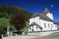 Das dreijochige Langhaus hat eine Stichkappentonne auf Gurten auf kräftigen gestuften Wandpfeilern. Die dreiachsige Westempore auf Pfeilern ist kreuzgratunterwölbt. Der Chorquadratturm ist romanisch. Das schmälere Turmquadratchor ist kreuzgratgewölbt und mit einem Rundbogen geöffnet mit einem über drei Stufen erhöhten Fußboden. Der Turm darüber ist niedrig und gedrungen und trägt ein Zeltdach. Der etwas breitere einjochige Chor ist kreuzgratgewölbt und schließt mit einer Halbkreisapsis. Die neuzeitliche Fronbogenmalerei schuf A. Amesbauer. Die Westfassade hat einen vorgelagerten zweiläufigen gedeckten barocken Treppenbau. An den Turmjochseiten sind barocke Außenfresken aus dem dritten Viertel des 18. Jahrhunderts, südlich Christus am Ölberg, nördlich Christus am Kreuz. Die Fresken stammen aus dem Jahr 1757 und die Glasfenster wurden erst nach dem Zweiten Weltkrieg im März 1951 eingesetzt. Nach dem Brand 1820 wurde die Kirche um barocke Außenfresken und den Treppenbau erweitert. Der romanische Turm und romanische Chor ist erhalten. Das barocke Langhaus ist aus dem 18. Jahrhundert.[1]