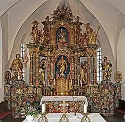 Der Hochaltar von 1742 ist ein barocker Opfergangsaltar mit geschlossener Mitte und seitlich vorspringender Säulenarchitektur. Die Tischlerarbeiten führte Jörg Mäglär aus Glödnitz aus, die Vergoldungsarbeiten stammen von Anton Valentin Karcher. Im Schrein steht eine Schnitzfigur der heiligen Margareta, flankiert von den Figuren der heiligen Bartholomäus, Andreas, Florian und Donatus. Im Aufsatz steht die Skulptur des heiligen Martin.