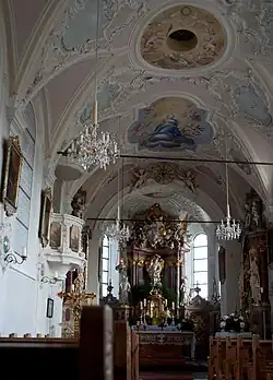 Das Kircheninnere zeigt ein tiefes Emporenjoch mit einer stützenlosen Empore und fünf Langhausjoche, das gotische Gewölbe wurde zu einer Stichkappentonne verschliffen, die Wände zeigen eine Pilastergliederung. Der Triumphbogen ist rundbogig. Im Chor links gibt es ein abgefastes Rundbogenportal zur alten Sakristei, darüber ein schmales Oratorium in einer nach außen vertieften Schildbogennische.