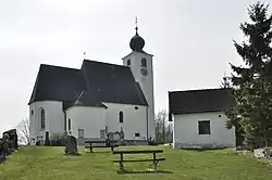 Zuvor befand sich hier eine Burg, die 1390 ebenso wie Burg Leonstein durch Herzog Albrecht III. belagert und erobert wurde.[2] Die heutige Kirche geht auf die romanische Burgkapelle von um 1200 zurück. Chor und Langhaus stammen in ihrer gotischen Form von 1457 und 1519. Im 18. Jahrhundert wurden die Sakristei im Süden und die Kreuzkapelle im Norden angebaut. Letzte Erweiterungen an der Südseite stammen aus den 1990er-Jahren.[3] Für die Kreuzkapelle wurden Steine aus den Grundmauern der Burg verwendet. Ein Tor dieser Burg stand noch im späten 18. Jahrhundert beim Eingang zum Kirchenplatz.[4]