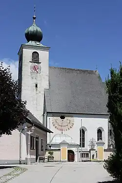 Die Kirche ist ein kleiner spätgotischer Bau. Sie hat einen Westturm mit barockem Zwiebelhelm. Nördlich des Chores ist die Kreuzkapelle von 1792 angebaut.[6] An der Südseite befinden sich der Anbau der Sakristei, ein von Hans Foschum gestaltetes Kriegerdenkmal und eine große Sonnenuhr von Hochmayr. Das Kriegerdenkmal und die Sonnenuhr stammen von 1955.[7]