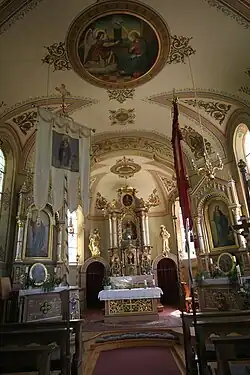 Das Langhaus ist dreijochig und weist verschliffene Ecken auf. Der Triumphbogen ist eingezogen und spitzbogig. Der einjochige Chor schließt im 3/8-Schluss. Langhaus und Chor sind stichkappentonnengewölbt. Die Fresken malte Johann Georg Buchauer im Jahr 1896. Am Chorbogen sind die „Verkündigung Mariens“ sowie die Heiligen Barbara von Nikomedien und Franz von Assisi dargestellt.
